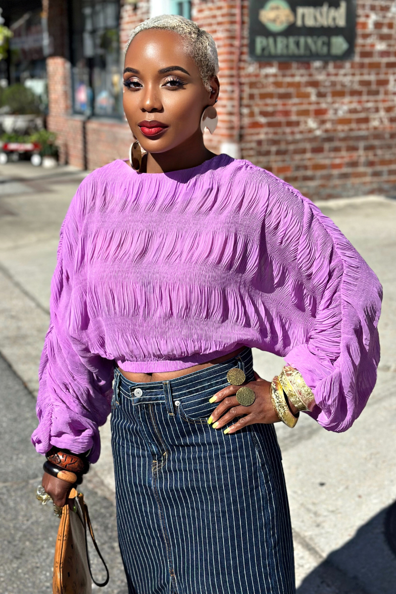 - Be daring in our chiffon ruched ballon crop top with a button neck! This top is perfect for those who aren't afraid to take risks and stand out from the crowd. Show off your boldness and style in this must-have top that is sure to inspire confidence and adventure.