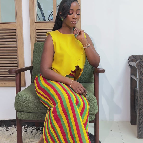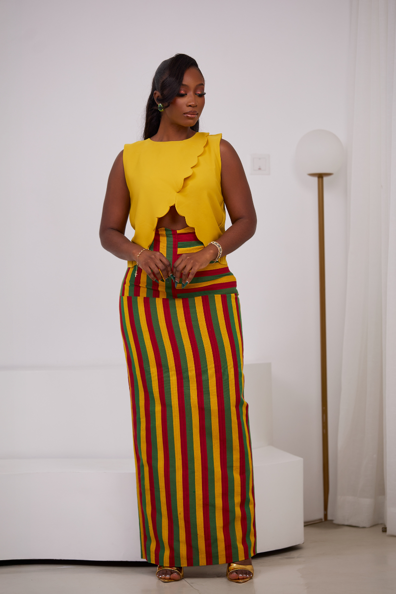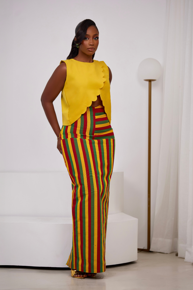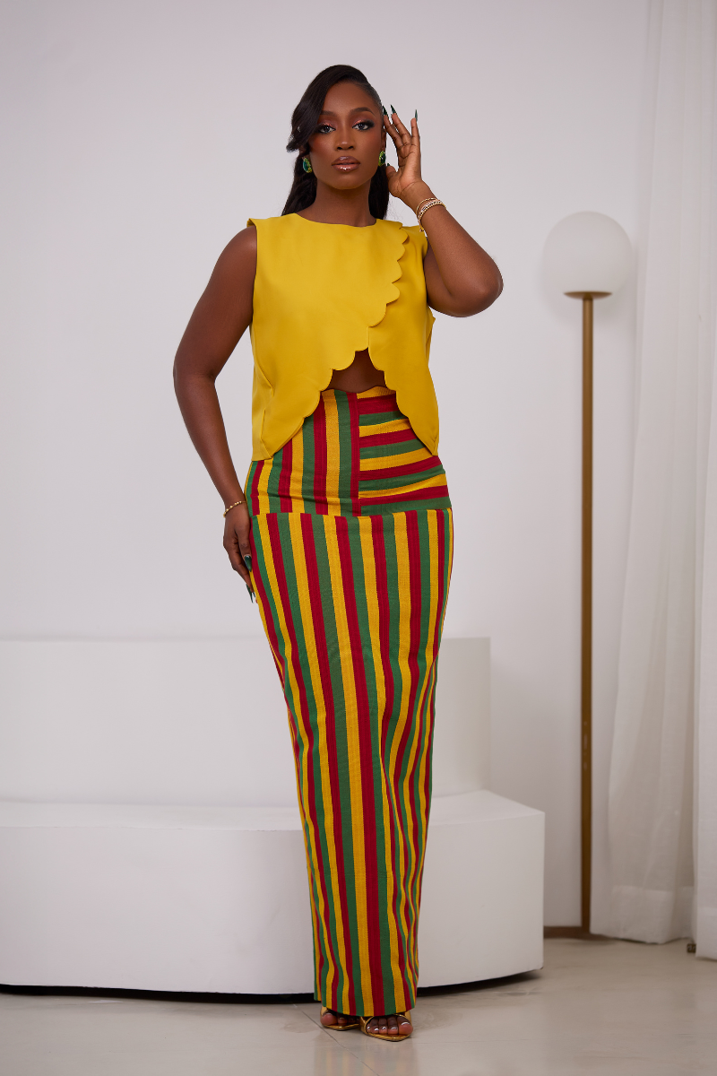 Make a bold statement this season with The Zaria Set — a playful yet polished two-piece outfit perfect for sun-drenched days and unforgettable nights. Featuring a sleek, figure-hugging yellow crepe crop top paired with a vibrant multicolor Asooke skirt, this set is all about color, culture, and confident femininity.