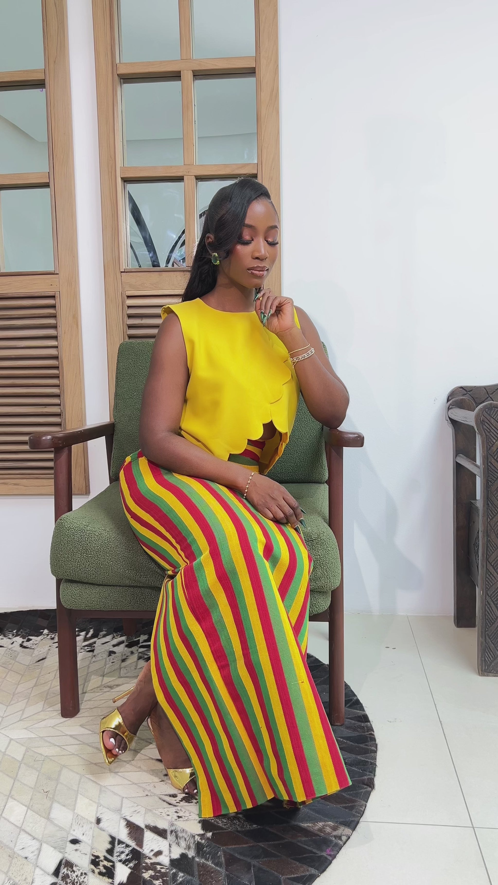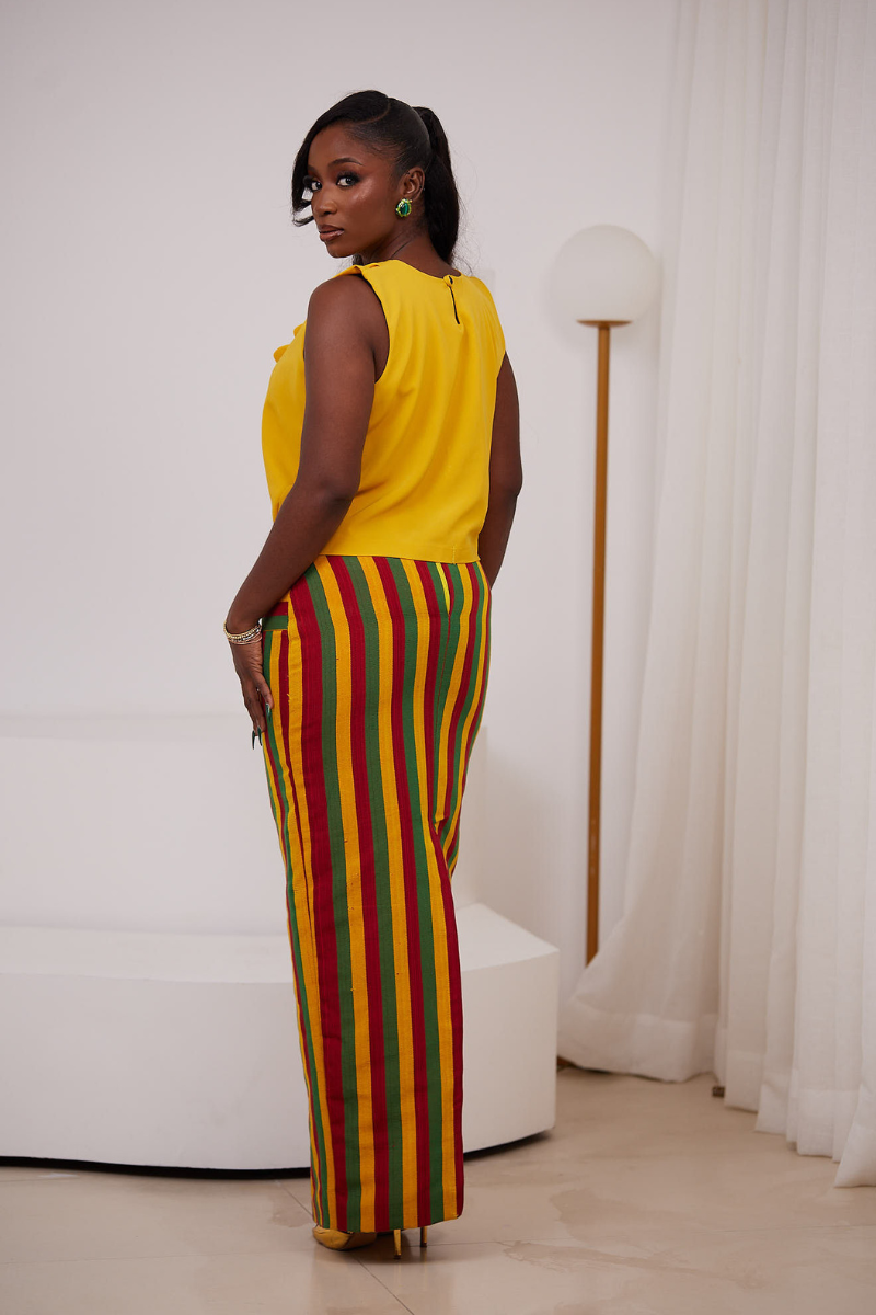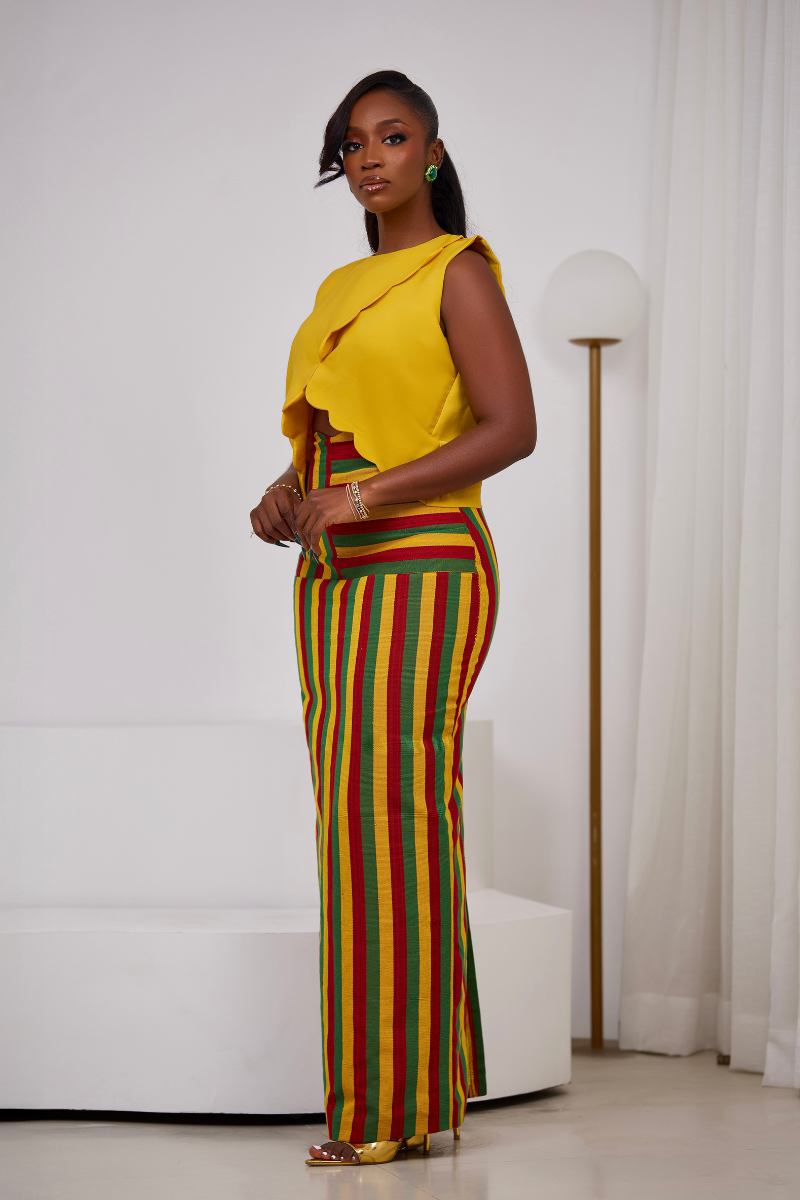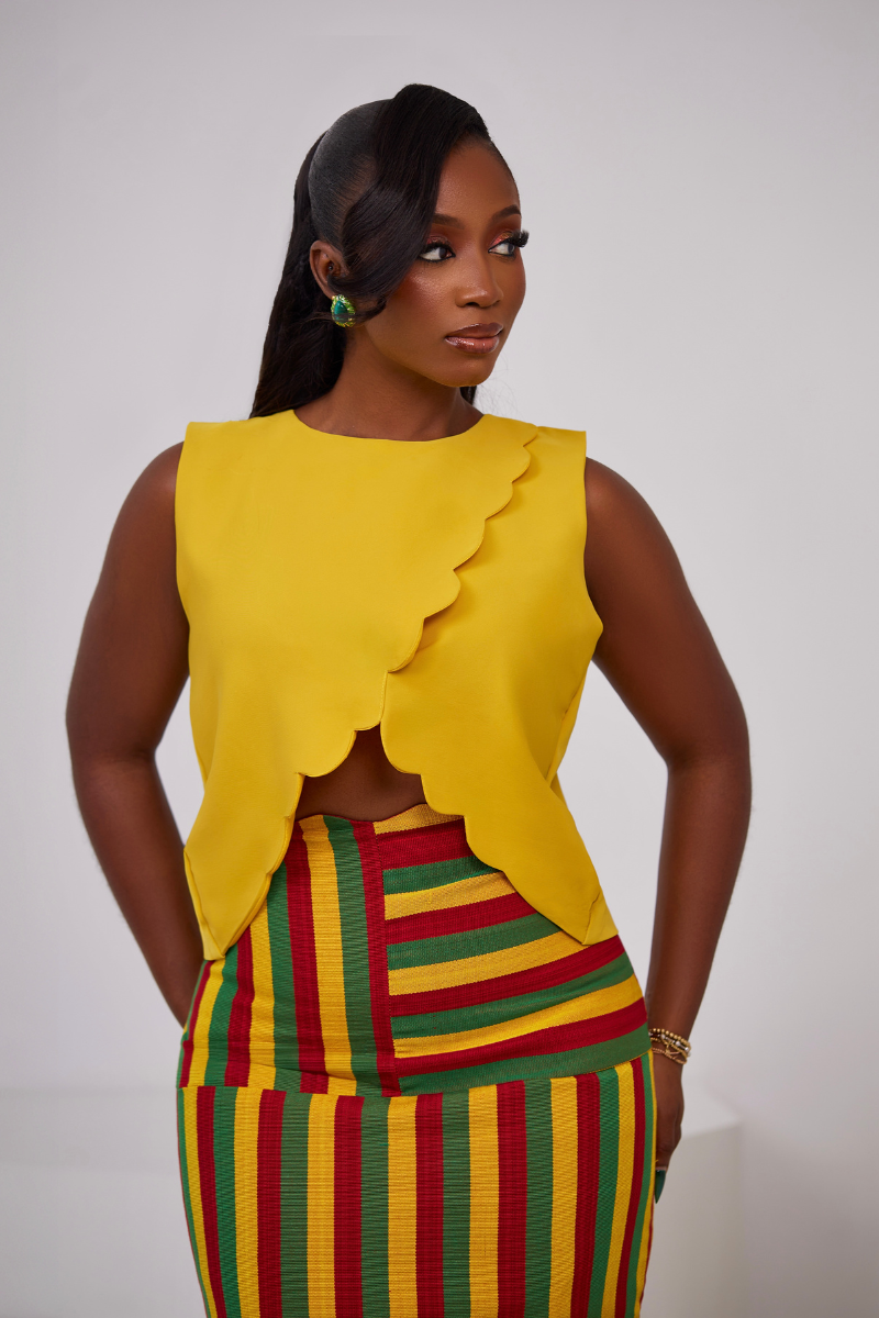 Make a bold statement this season with The Zaria Set — a playful yet polished two-piece outfit perfect for sun-drenched days and unforgettable nights. Featuring a sleek, figure-hugging yellow crepe crop top paired with a vibrant multicolor Asooke skirt, this set is all about color, culture, and confident femininity.
