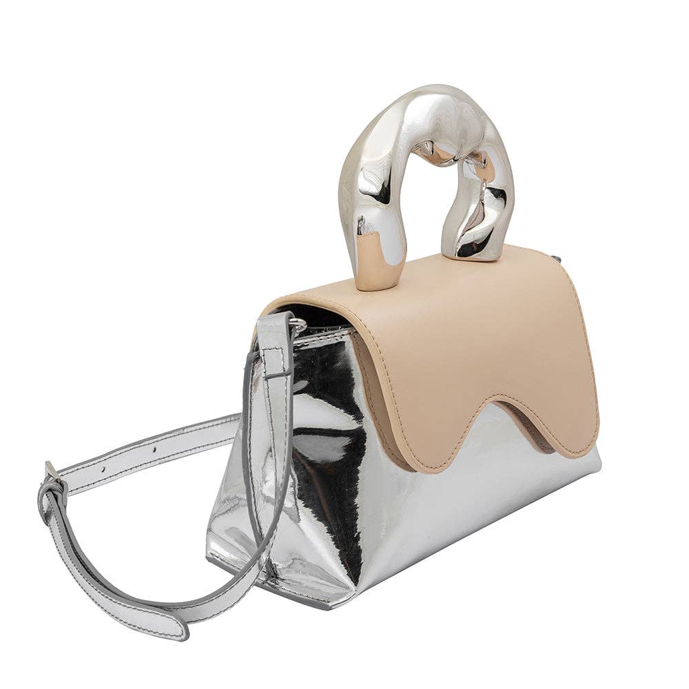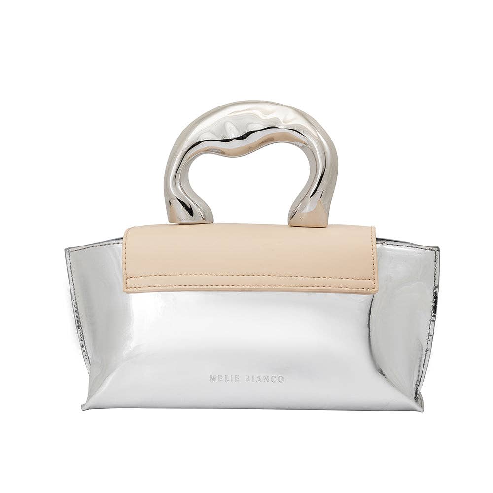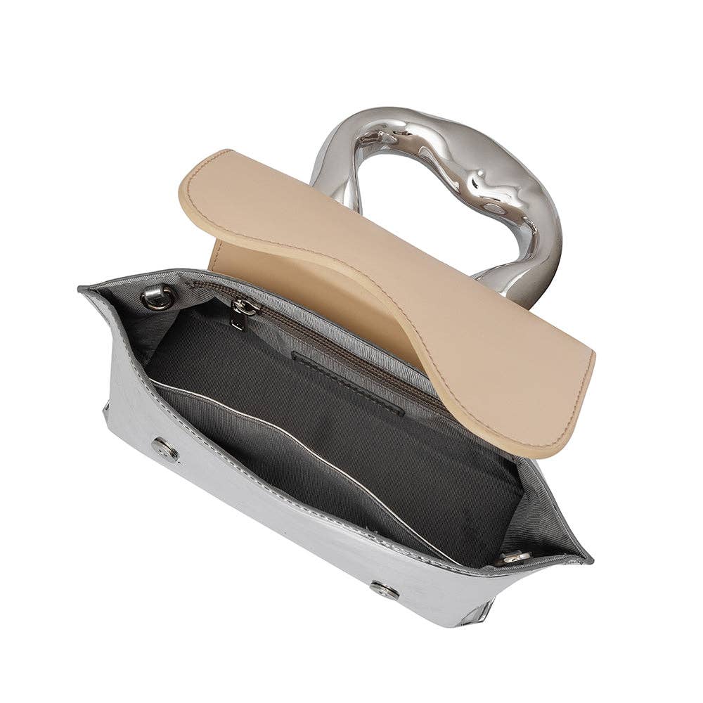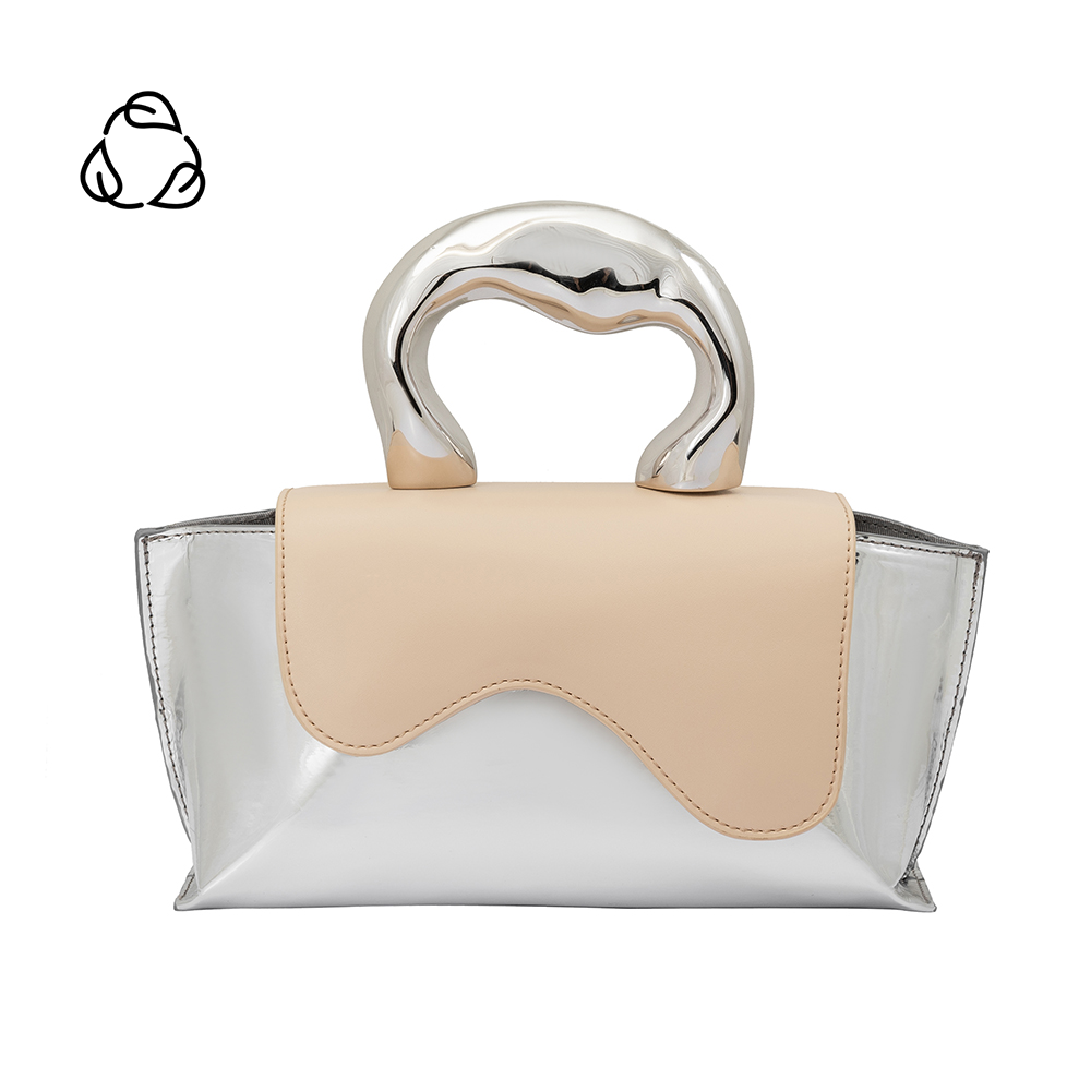 - This Akari Snow Drop Vegan Top Handle Bag is a strikingly unique and detailed accessory. Crafted from recycled vegan leather, this metallic bag showcases both fashion and sustainability. The adjustable strap allows for comfortable crossbody wear, while the interior features a slip and zip pocket. With its OEKO-TEX certified lining, this bag can fit an iPhone 14 Pro and its zipper closure ensures security. Silver-tone hardware adds a touch of elegance.