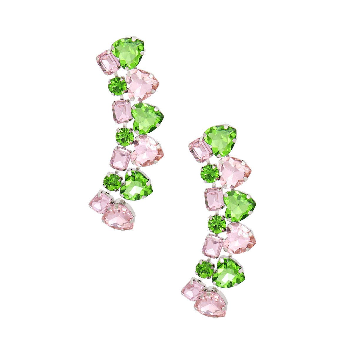Women's Dangle Stud Earrings Silver Metal with Pink or Green Heart and Radiant Cut Shaped Crystals Featuring Linked Angle Drop Design. Post Backing. 3.25 x 1".