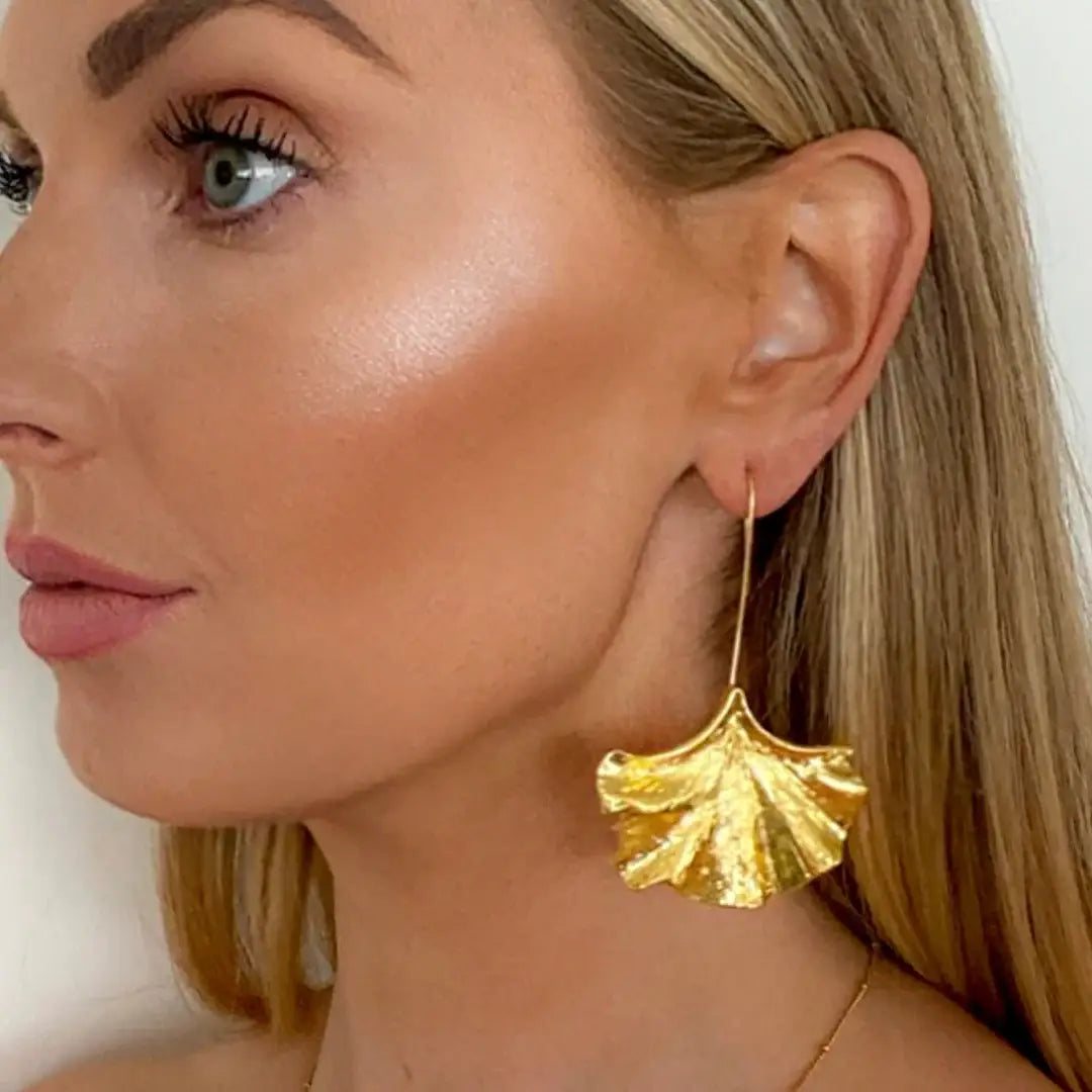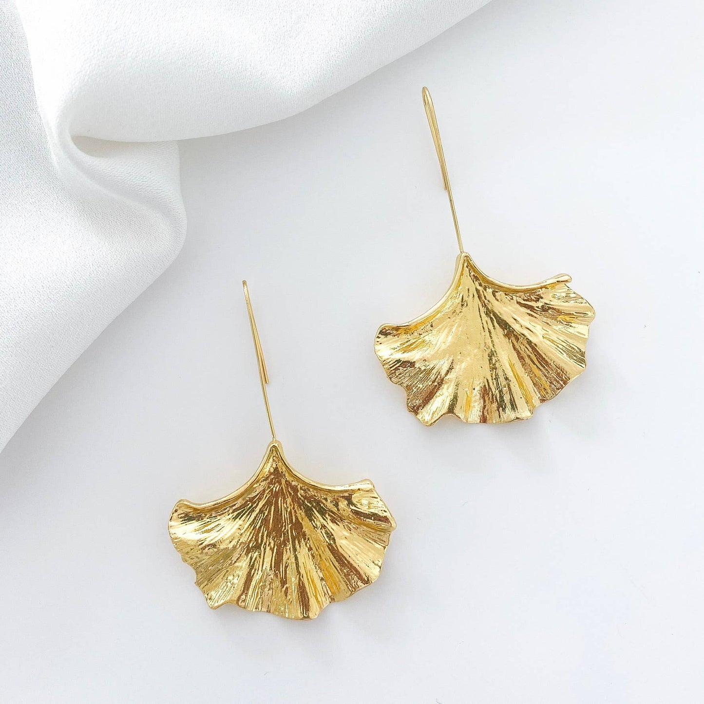 - Add a touch of originality to any look with our Drop Fan Gold Leaf Earrings! Featuring a fan-shaped design that instantly stands out, these earrings will be your go-to for a night out, holiday, or friend's wedding - we think they’re fan-tastic! - nickel, lead and cadmium free - statement earrings - fan leaf shape - drop earrings