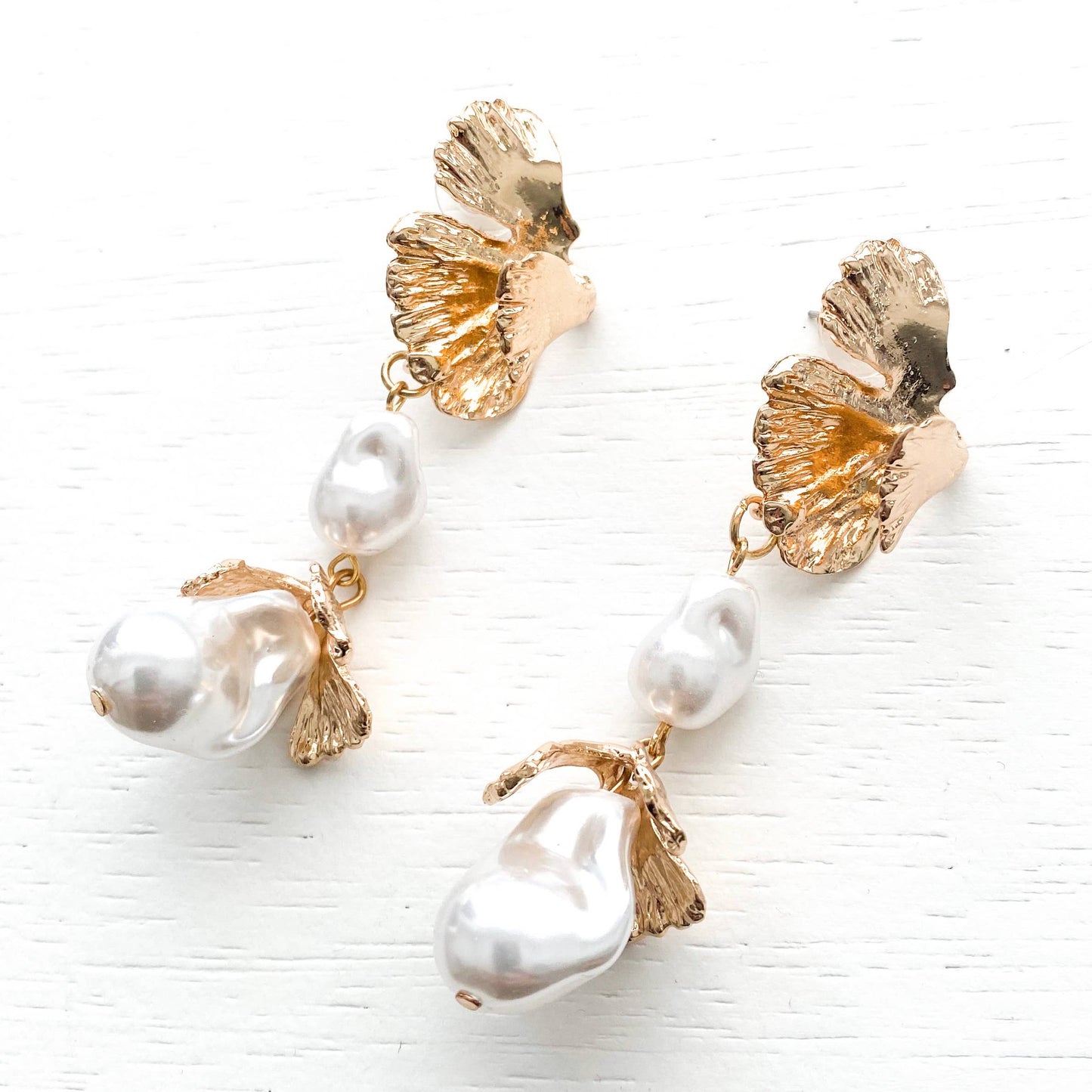 - Enhance your style with sophistication using our Pearl Bud Fan Leaf Drop Statement Earrings. Featuring a luxurious gold leaf design and baroque pearls, these earrings are perfect for all your special occasions. Enjoy the versatility of these earrings, from summer vacations to holiday parties, while staying worry-free with their nickel, lead, and cadmium-free composition. Elevate your look with these statement earrings that exude elegance and class.