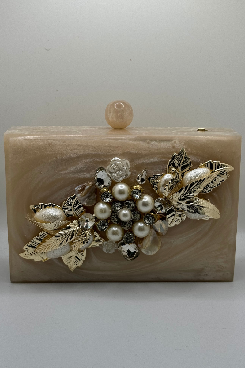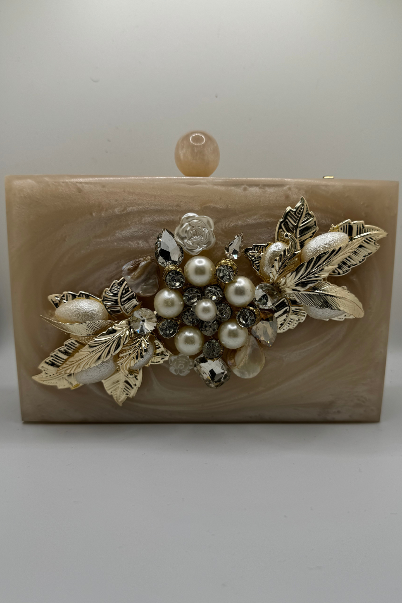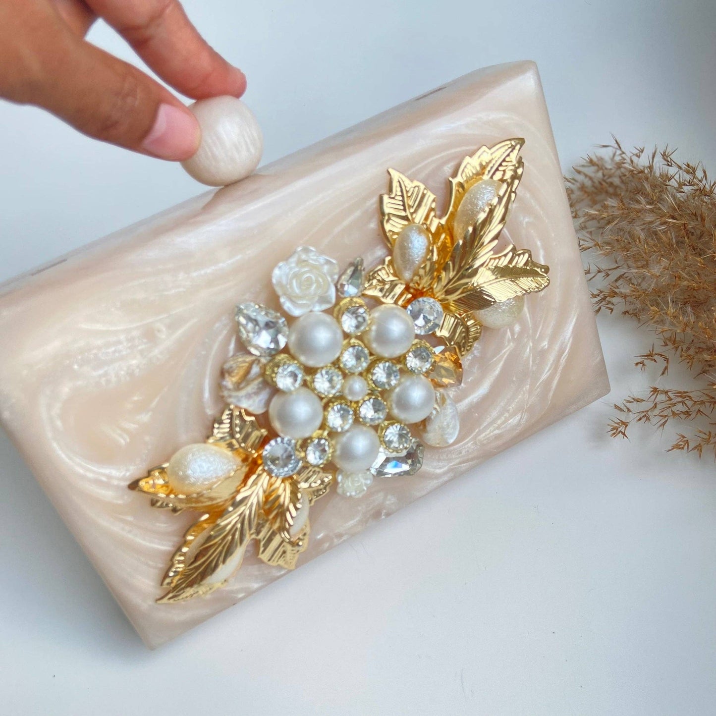- The PREET clutch is handcrafted using white resin and features a stunning brooch with pearl accents. It is completed with a sophisticated clasp and can be worn as a stylish arm accessory. A golden sling is also included for added convenience.