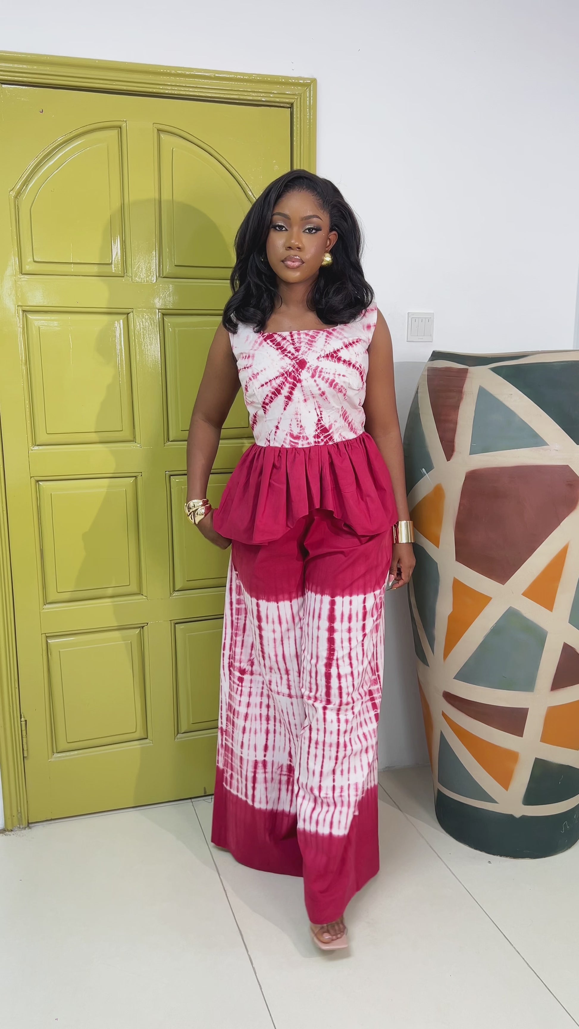 Made from authentic Adire tie and dye fabric, this two-piece set features a beautifully asymmetrical cut peplum top paired with wide-leg pants measuring 46 inches in length—perfect for resort escapes, warm-weather events, or elevated everyday wear.