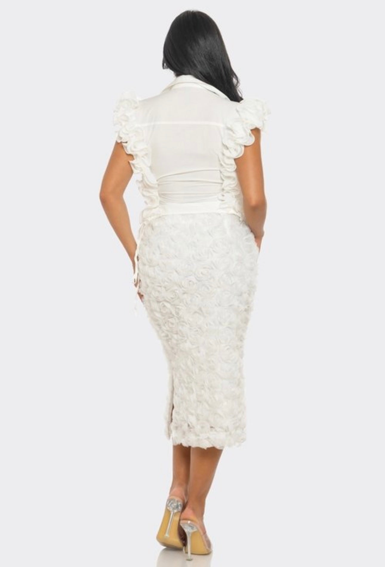 - Elevate your style with our sophisticated Rosette Embellished skirt set. This two-piece outfit includes a tailored button-down blouse embellished with charming rosette accents on the shoulders, bringing a touch of romance to a timeless design. Please select your true size for the perfect fit.