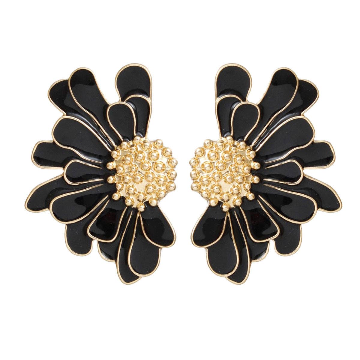 Elevate your style with these daring Black Half Daisy Flower Earrings! Show off your bold personality with the striking combination of gold metal and black epoxy, complete with a gold studded center for added edge. These earrings are perfect for any occasion and will be sure to make a statement wherever you go. So why wait? Add these earrings to your collection and embrace the thrill of taking risks. Your inner fashionista will thank you!