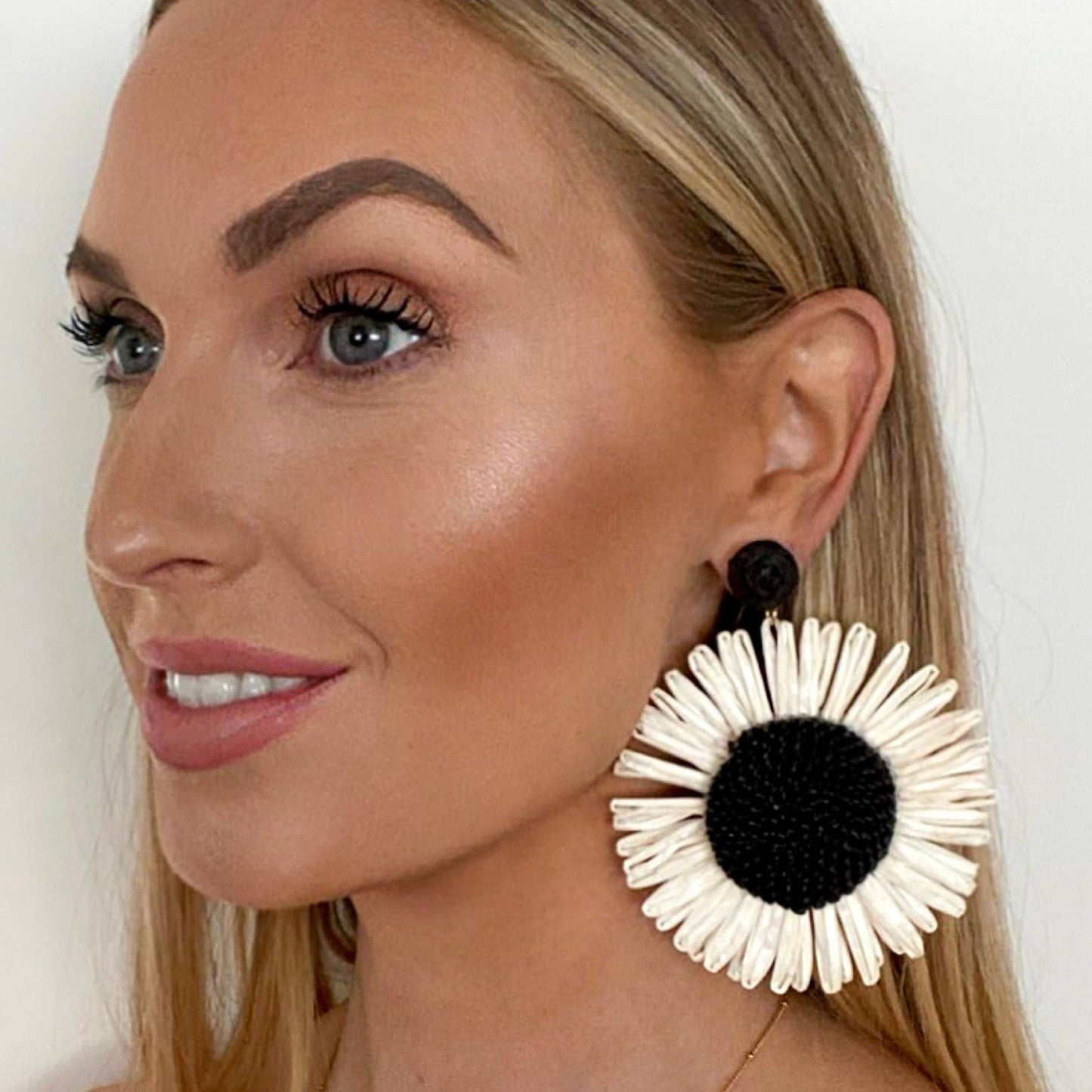 - Introducing the bold and striking Boho Woven Black and White Sunflower Earrings. These earrings are a stunning addition to any summer look, bringing a touch of sophistication and charm. The timeless monochrome design and statement sunflower shape make these earrings a must-have for any fashion-forward individual. Plus, they are nickel, lead, and cadmium free, ensuring safe wear for all.