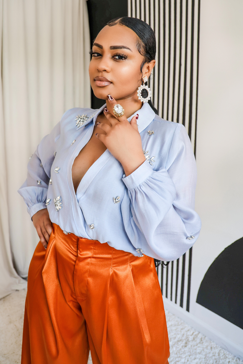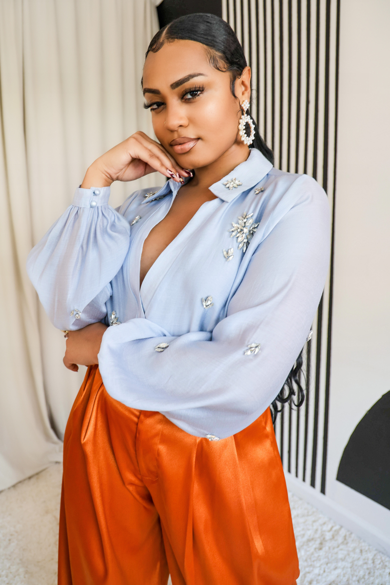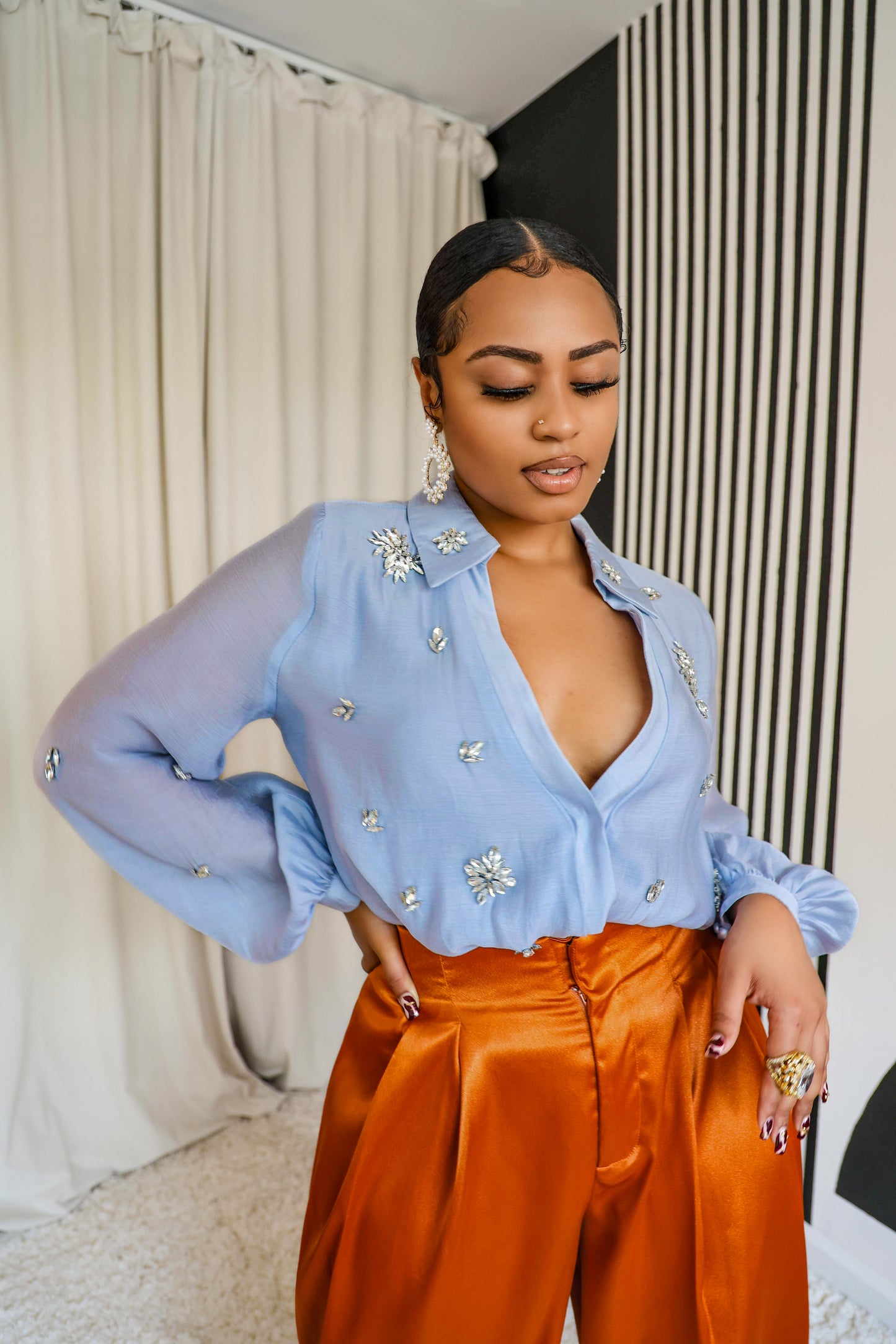 - Elevate your wardrobe with our chic and stylish woven bodysuit, featuring jewel detailing and a unique collar. This functional long sleeve top has a back zipper for added flair.