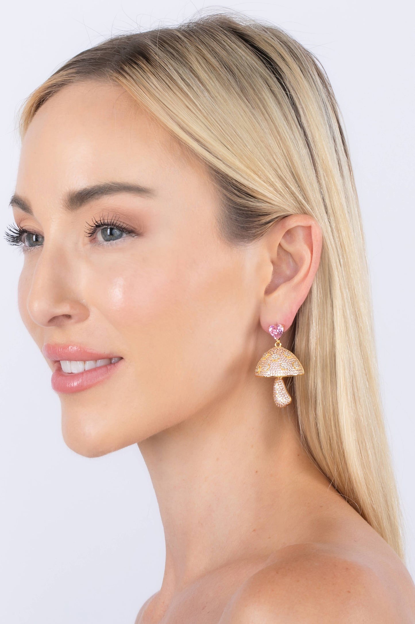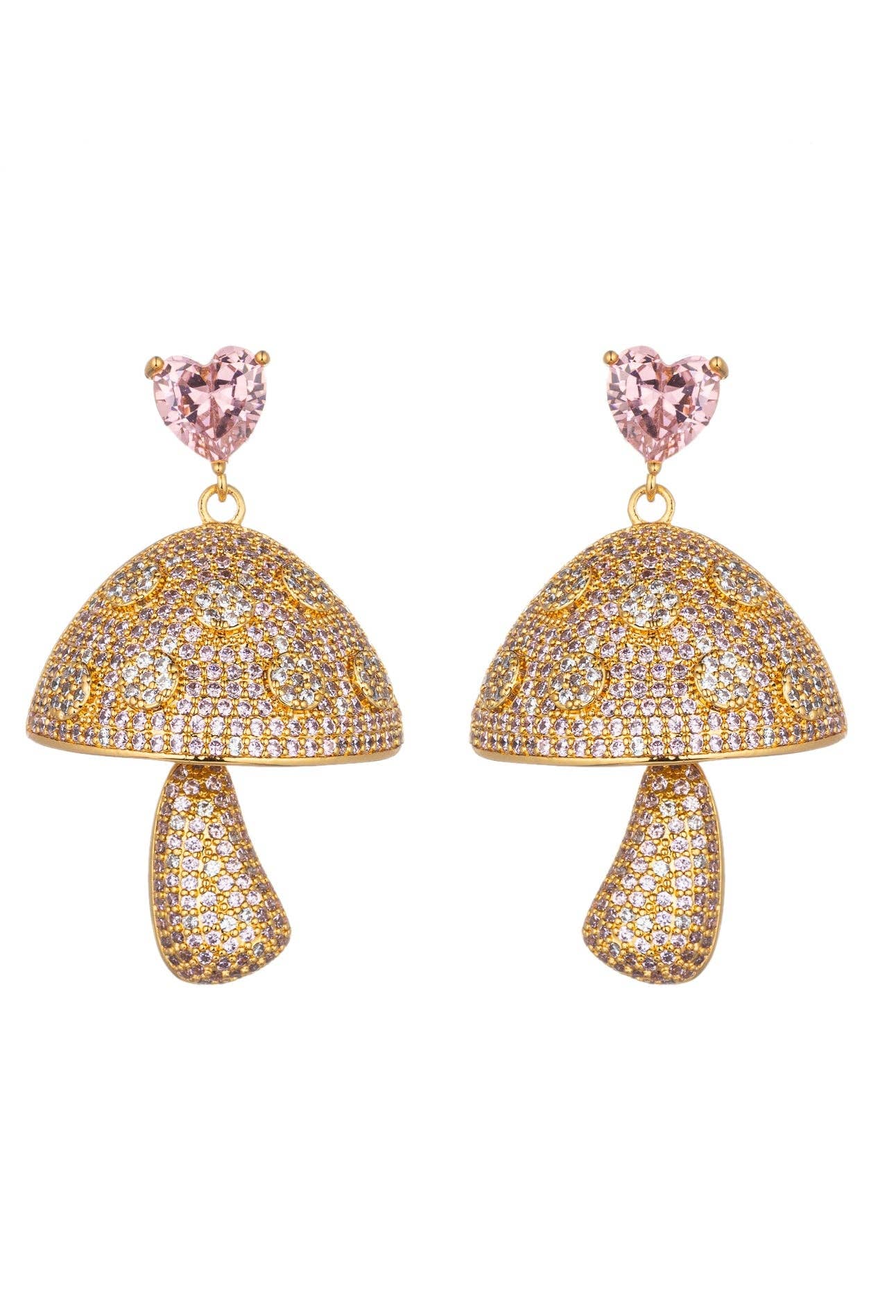 - These exquisite Pink Mushroom Heart Drop Earrings are expertly crafted with a brass infused gold tone. The alluring heart design and sparkling cubic zirconia add a touch of glamour. The delicate mushroom motif provides a sophisticated finishing touch.