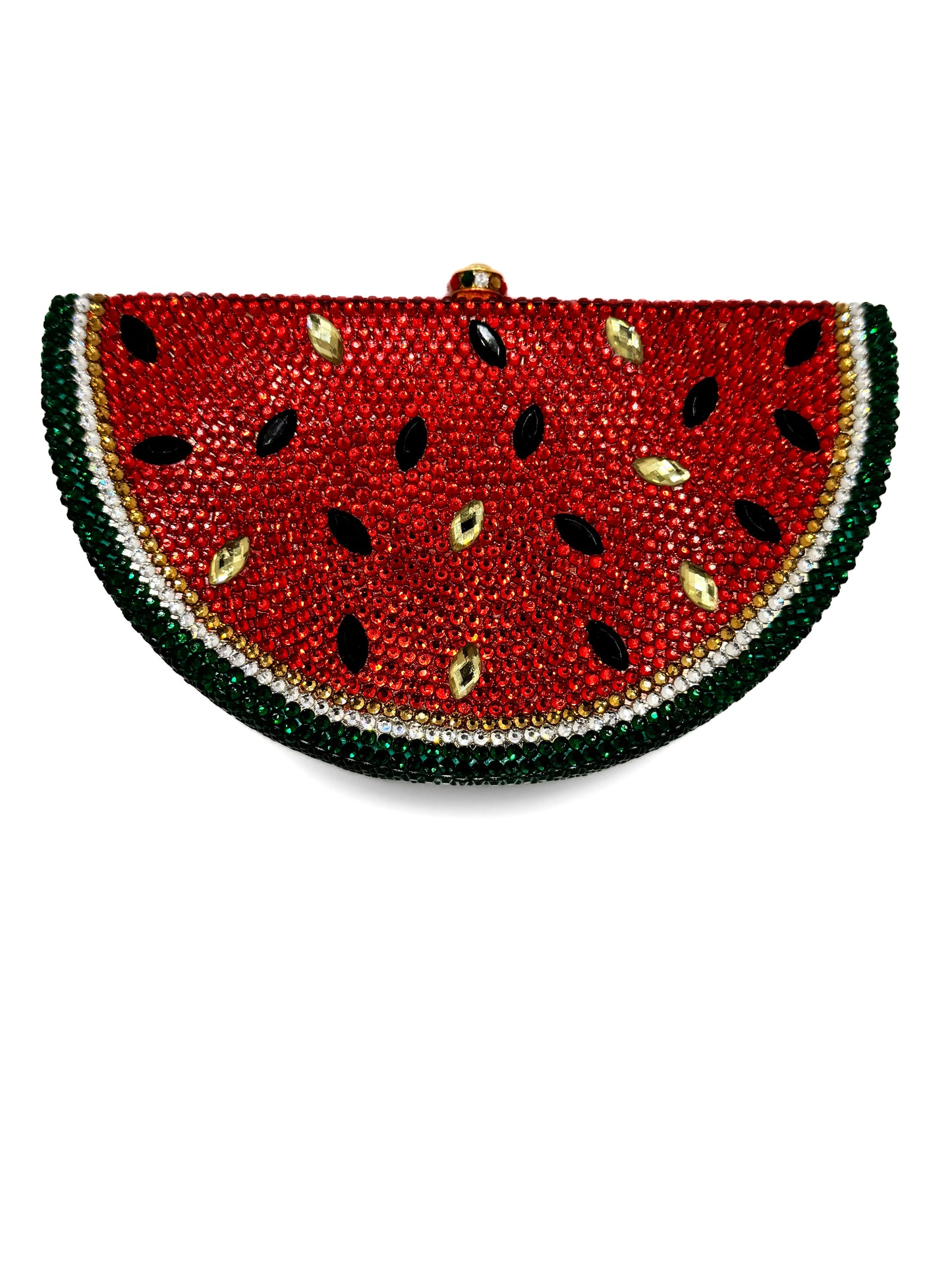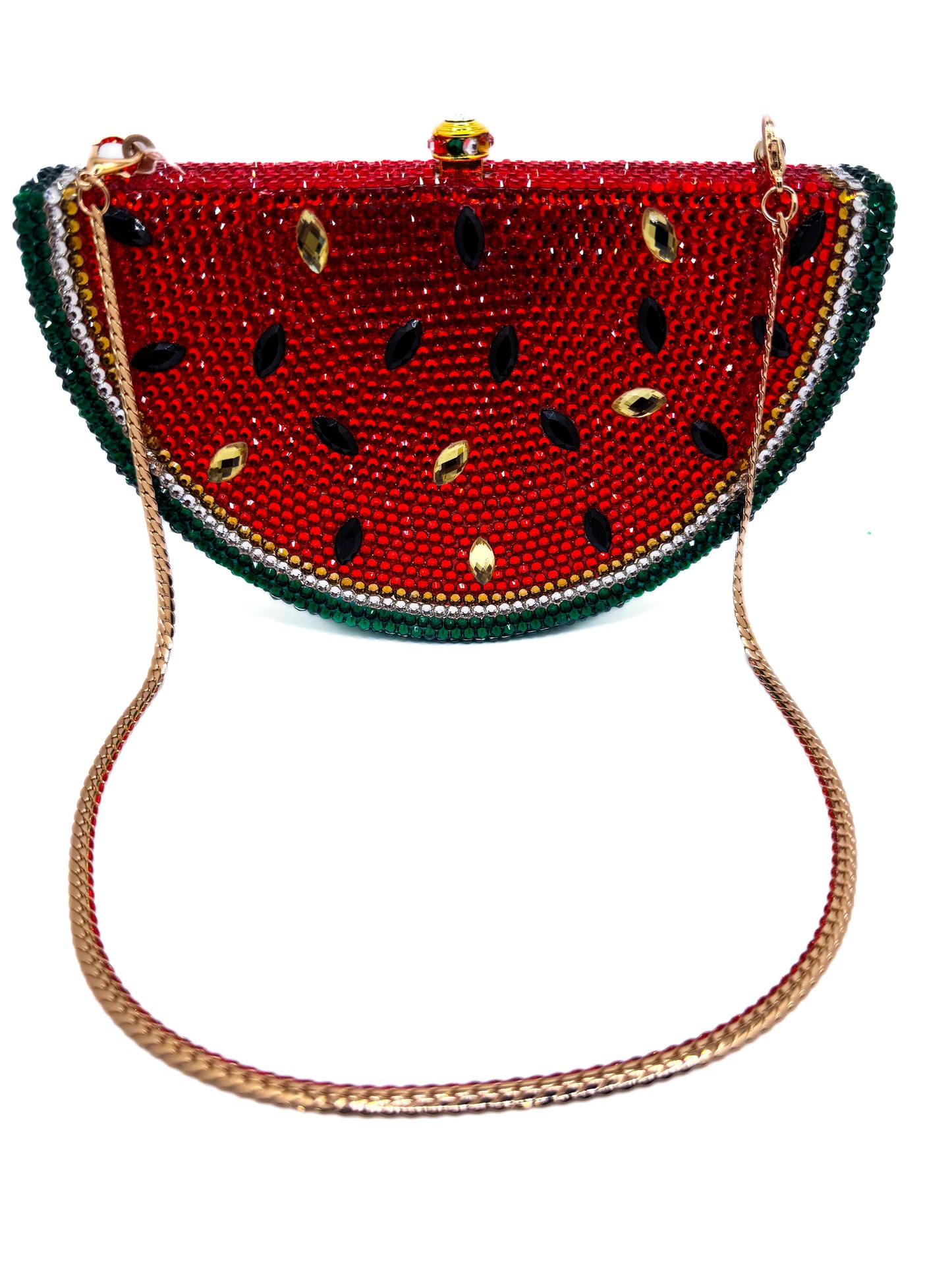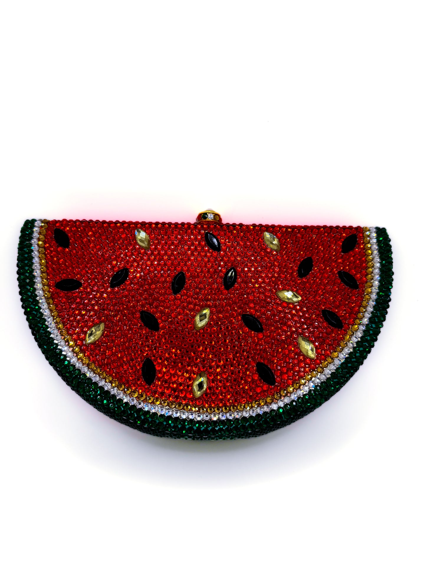 - Add some sparkle to your ensemble with our "Juicy Melon Purse" - a circular, hard silt pocket clutch that exudes luxury and trendiness with its rhinestone embellishments. This eye-catching fruit clutch is sure to make a statement and elevate your look.