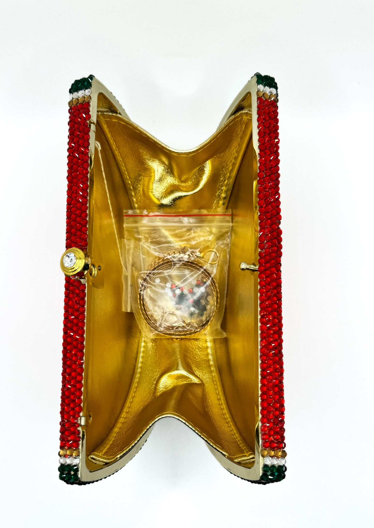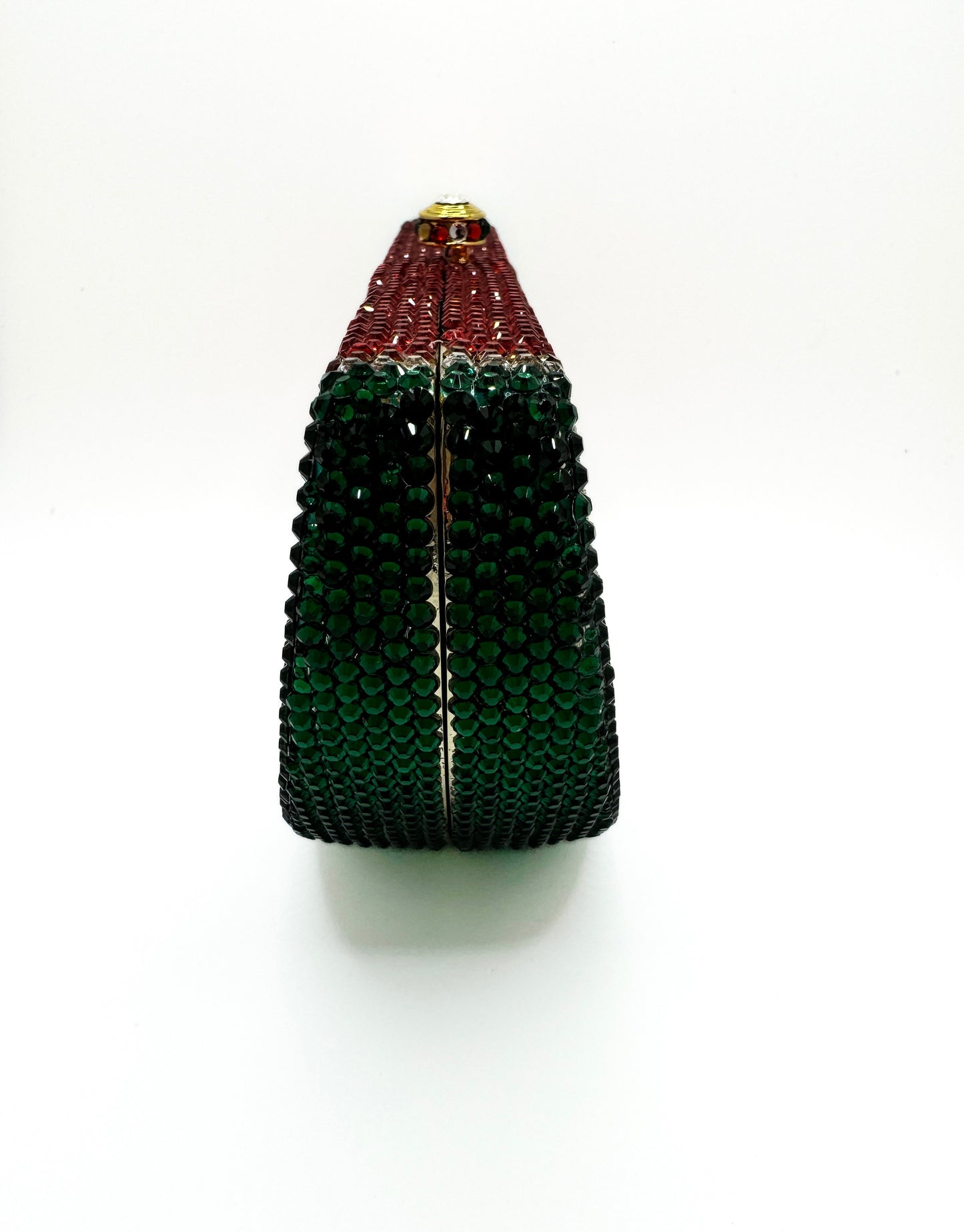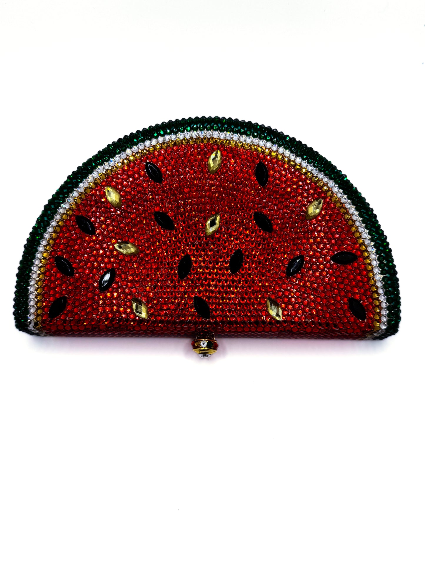 - Add some sparkle to your ensemble with our "Juicy Melon Purse" - a circular, hard silt pocket clutch that exudes luxury and trendiness with its rhinestone embellishments. This eye-catching fruit clutch is sure to make a statement and elevate your look.
